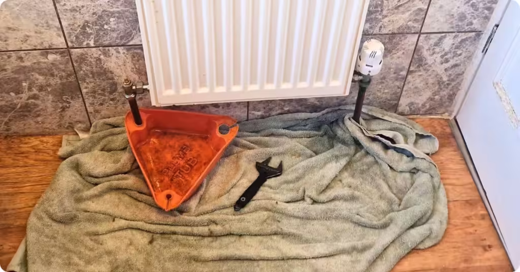 Put at least one old towel down under the radiator valves and around the pipes to catch any water spills. The water could be black and sludgy and won’t come off anything it touches so make sure your carpet and flooring is well covered.